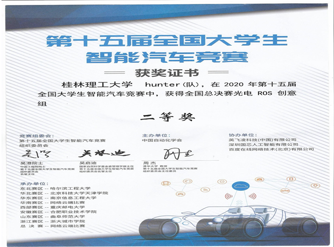 据悉,自第十五届全国大学生智能汽车竞赛组委会在7月4日公布了室外光电ROS预赛方案后,最终有效报名队伍数量达139支。经过线上选拔赛的比拼,最终四十支队伍进入第二轮线下比赛。beat365机械与控制工程学院Hunter队(指导老师:梁勇,参赛队员:甘礼福、崔启、陈家彬、翟思敏、谢植送)是ROS创意组广西唯一入围全国总决赛参赛队伍。Hunter队各成员经过3周的全力备赛,与来自全国入围总决赛的40只队伍进行激烈比拼后,最终在全国总决赛中脱颖而出,获得佳绩。