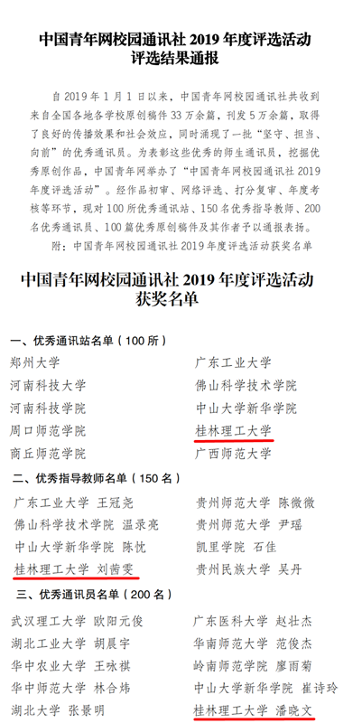 据悉,beat365中国青年网通讯站自2015年12月挂牌建站以来,在学校党委领导和团委指导下,积极在中国青年网发布优秀原创新闻稿件,致力于讲好桂工校园故事、传播桂工正能量。截至目前,beat365已连续四年荣获“中国青年网优秀通讯站”称号。