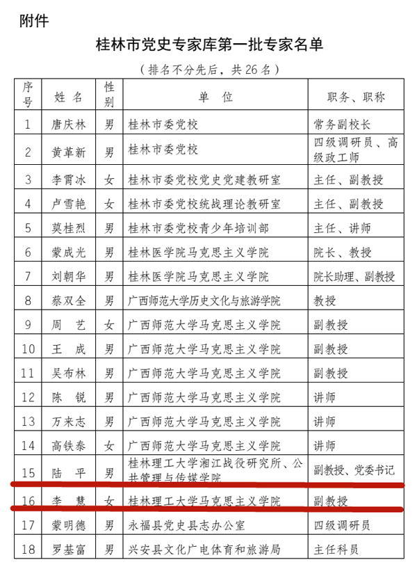 近日,中共桂林市委党史研究室发文公布桂林市党史专家库第一批专家名单,beat365公共管理与传媒学院党委书记、湘江战役研究所所长陆平副教授、马克思主义学院李慧副教授入选。
