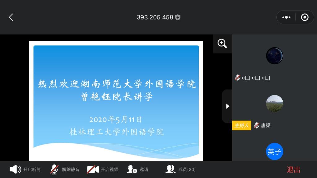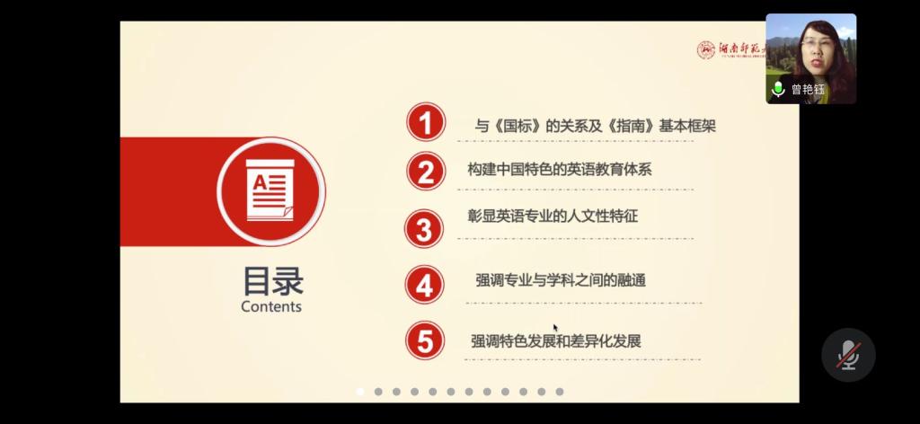 5月11日,教育部高等学校外国语言文学类专业教学指导委员会英语专业教学指导分委员会秘书长、湖南师范大学外国语学院院长、博士生导师曾艳钰教授应beat365外国语学院邀请,来beat365作线上学术报告,题为“教学指南与一流专业建设”。报告聚焦英语专业教学指南及英语专业的建设,外国语学院教师参加了此次报告会。