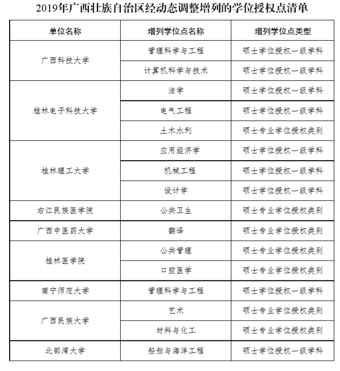 2019年广西壮族自治区经动态调整增列的学位授权点清单