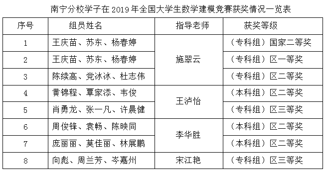 1月4日,2019年“高教杯”全国大学生数学建模竞赛广西赛区颁奖大会在广西民族大学举行。南宁分校学子共获专科组国家级二等奖1项,专科组广西赛区一等奖1项、二等奖1项、三等奖2项,以及本科组广西赛区二等奖3项。