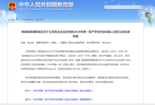 《教育部高等教育司关于公布有关企业支持的2019年第一批产学合作协同育人项目立项名单的函》