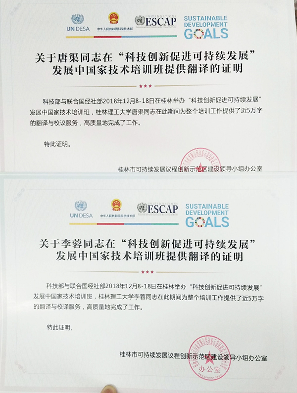 12月9日至12月17日,由中国科技部、联合国经社部和联合国亚太经济社会委员会联合主办、桂林市承办的“科技创新促进可持续发展国际培训班”在桂林市举行,由联合国及相关国家的政府官员、专家学者进行20场专题授课,来自30多个发展中国家的专家学者和政界领导参与了培训。此次培训旨在加强广大发展中国家科技创新促进可持续发展方面的交流及信息共享,以及分享中国国家可持续发展议程创新示范区建设的成功实践和经验。beat365外国语学院积极配合桂林市科技局的工作,提供了全程志愿者服务和翻译服务等工作。