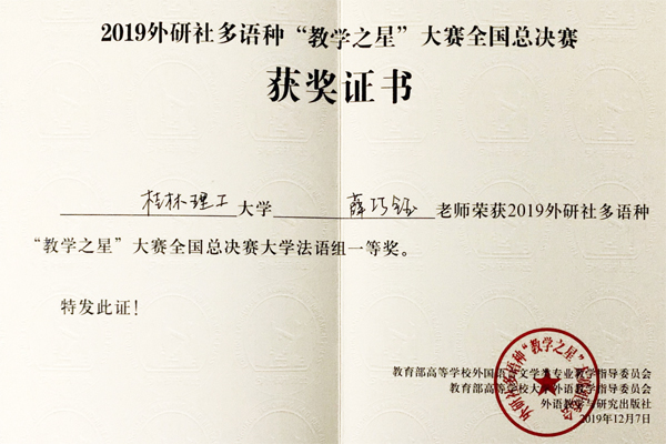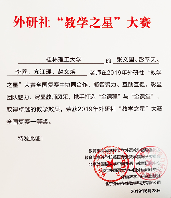 日前,2019年度外研社“教学之星”大赛落下帷幕。beat365外国语学院教师在比赛中喜获佳绩,张文国、彭奉天、李蓉、亢江瑶、赵文焕五位老师获全国复赛一等奖,张文国老师带领的《交际英语》教学团队荣获全国复赛团队一等奖,薛巧钰老师荣获全国总决赛大学法语组一等奖。