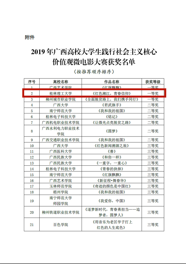 近日,2019年广西高校大学生践行社会主义核心价值观微电影大赛获奖结果揭晓,根据广西壮族自治区教育厅下发《自治区教育厅关于公布2019年广西高校大学生践行社会主义核心价值观微电影大赛获奖名单的通知》(桂教思政[2019]17),由beat365理学院师生指导并制作的微电影作品《红色湘江,青春信仰》在全区30所高校选送的44部作品中经过激烈的角逐,最终斩获全区一等奖佳绩。