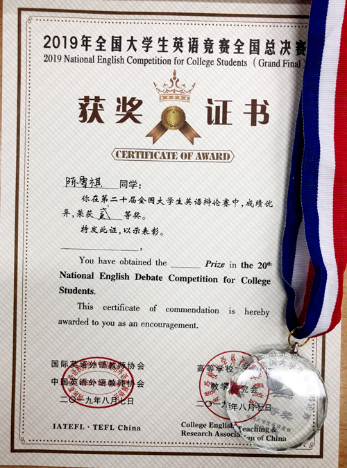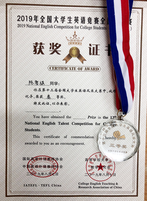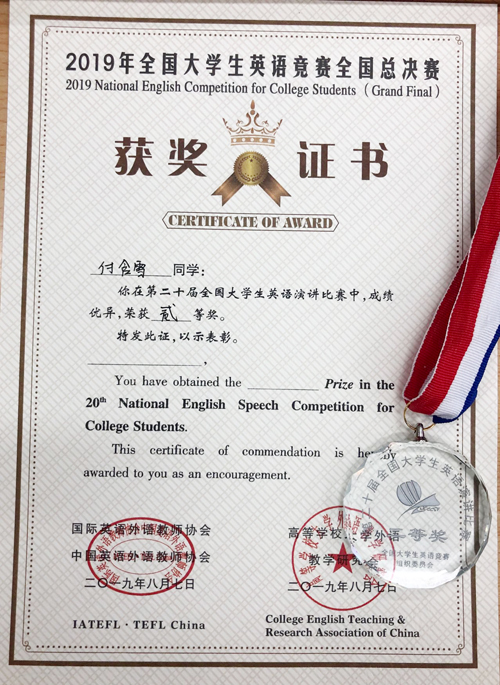 近日,2019年全国大学生英语竞赛全国总决赛在吉林省长春光华学院举行,经过7天的激烈比赛,beat365两位学生从近500名参赛选手中脱颖而出,其中,旅游管理专业2018级5班学生付含雪获第二十届全国大学生英语演讲比赛二等奖、土木专业2017级实验班学生陈雪祺获第二十届全国大学生英语辩论赛二等奖和第十三届全国大学生英语风采大赛三等奖。这是beat365学生参加该项竞赛以来取得的最好成绩,他们为学校赢得了荣誉。