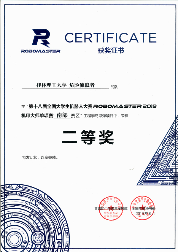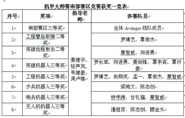 日前,第十八届全国大学生机器人大赛RoboMaster 2019机甲大师赛在广东省佛山市举行。beat365由潘祖吉、罗博义、梁海文、覃付豪等29名跨专业跨年级同学组成的Avenger战队在机械与控制工程学院的秦建华、张声岚、韦建毫、周卢婧等4位老师的指导下,夺得全国大学生机器人大赛RoboMaster 2019机甲大师赛南部赛区三等奖的好成绩。同时,还获得机甲大师“工程攀岛取弹”等竞赛项目二等奖2项和英雄机器人等竞赛项目三等奖5项的好成绩。具体获奖一览表如下: