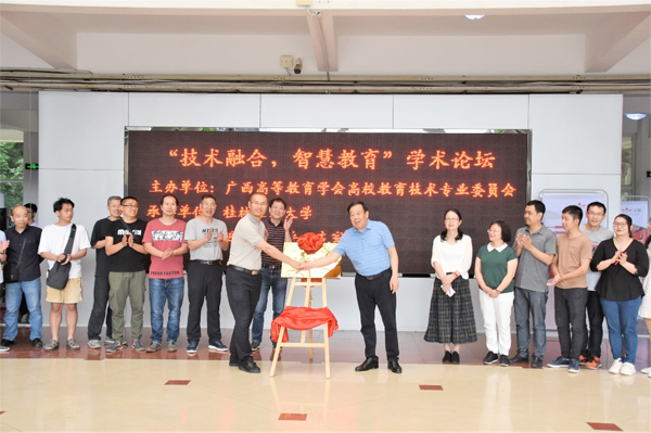 梁福沛副校长(前排右)与学堂在线潘守东副总裁(前排左)为智慧教学实践基地揭牌