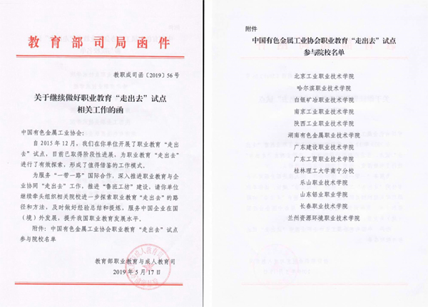 近日,教育部司局函件《关于继续做好职业教育“走出去”试点相关工作的函》(教职成司函〔2019〕56号)公布了中国有色金属工业协会职业教育“走出去”13所试点院校名单,beat365南宁分校位列其中。