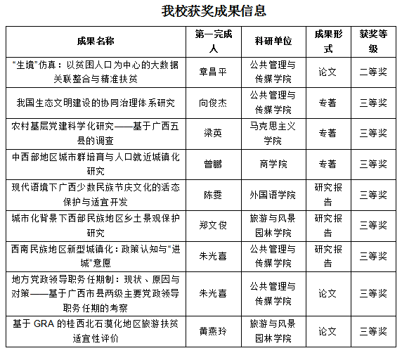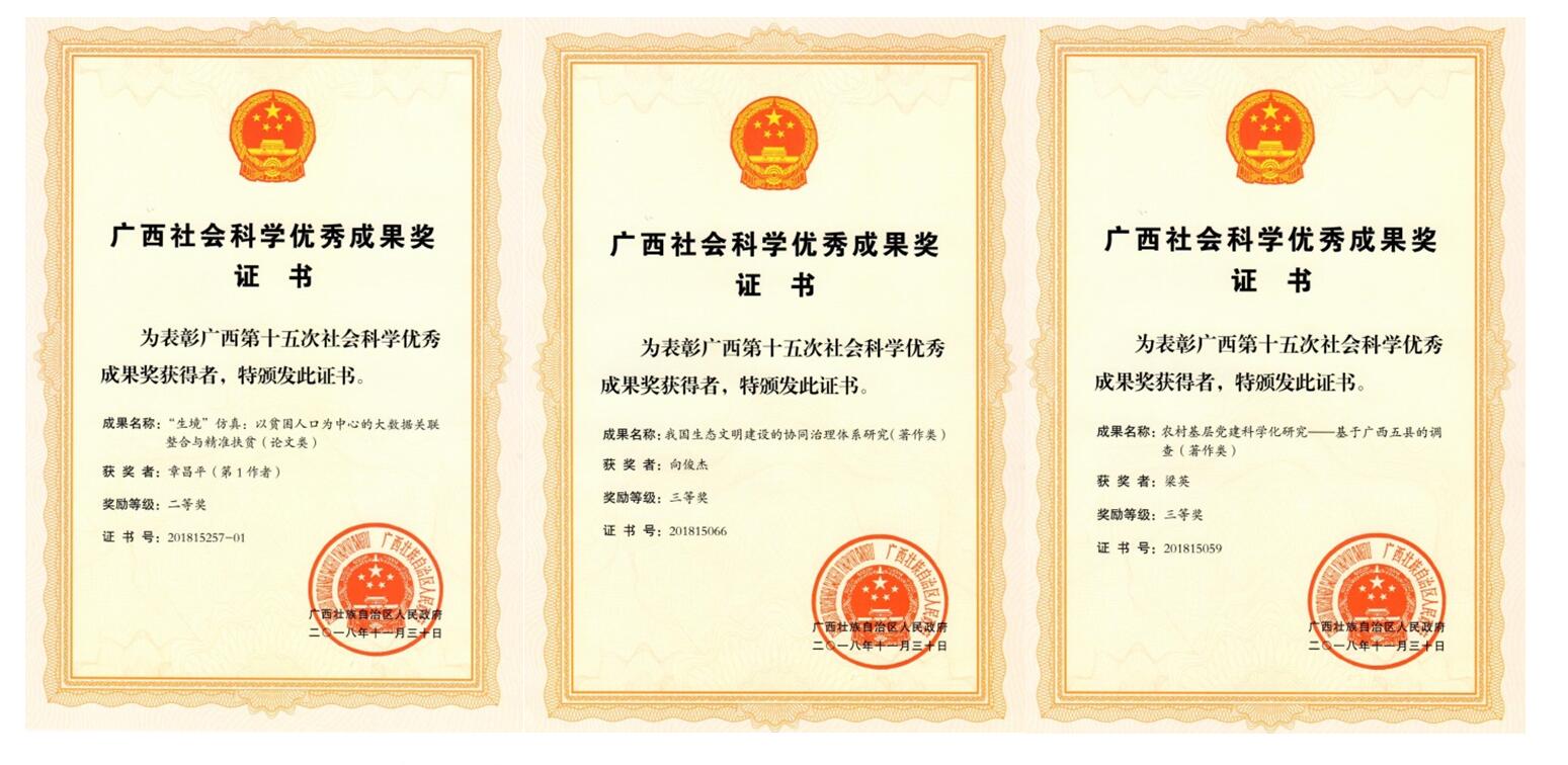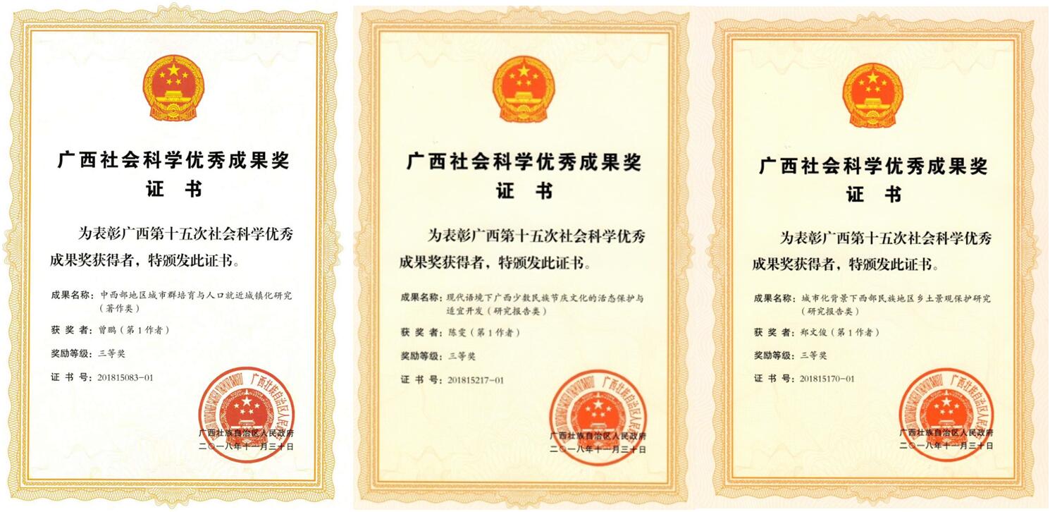 近日,广西区人民政府下发了广西第十五次社会科学优秀成果奖奖励证书,beat365共有9项参评成果获奖,其中二等奖1项,三等奖8项。广西社会科学优秀成果奖是广西社会科学成果的最高奖项,每两年评选一次。近年来,beat365在社会科学领域的研究能力逐年提升,为地方经济社会发展做出了积极的贡献。本次具体获奖成果如下:
