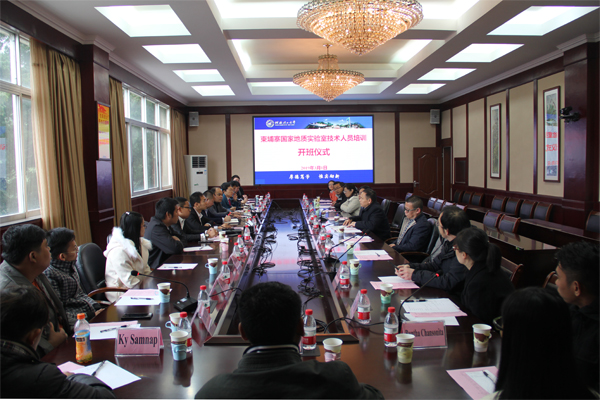 罗汉军副调研员代表广西自然资源厅对各方在援建项目中所做的工作表示感谢,并预祝培训取得圆满成功。他同时提出了以下希望:一是培训班要努力取得良好培训效果,要在教学、学生的学习生活条件等方面尽最大努力做好服务工作;二是希望培训教师倾囊相授,做好教育教学工作,提高培训质量;三是学员要努力学习,争取学成满载而归。他指出,学员们都是柬方精挑细选出来的精英,希望学员们珍惜机会,勤奋好学,培训结束后不但把所学知识带回国,同时把中国人民和广西人民的深情厚谊带回国,为促进中柬友谊长存做贡献。韦启锋处长在发言中表示,培训班能顺利开班与柬埔寨方有关方面和beat365的大力支持分不开。他详细介绍了援建项目的起源与推进过程、培训的意义等。化学与生物工程学院院长李建平教授介绍了培训班的筹备情况和培训班的师资安排情况。本期培训班班主任、应用化学教研室袁亚利博士详细介绍了培训的授课方案以及对培训学生的基本要求等。
