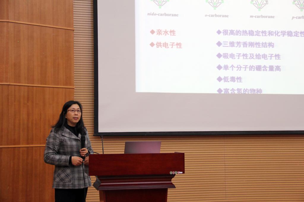 在特邀报告环节,燕红教授、潘安强教授分别作了题为“碳硼烷功能化及应用潜能”“高容量电极材料优化设计及其电化学行为研究”的学术报告。燕红教授从碳硼烷的性质、碳硼烷衍生物的应用、碳硼烷化学重要研究发展、碳硼烷调控配合物的发光及碳硼烷调控三苯胺衍生物的双光子吸收等方面详细介绍了碳硼烷,并以大量的实例阐释了碳硼烷衍生物发光材料及其在生物成像等方面的潜在应用。燕红教授谈到,搞科研要有恒心,忌讳跟着热点转,盲目换研究方向。潘安强教授在报告中介绍了高容量电极材料优化设计的社会背景,从锂离子电池的性能与材料的密切关系指出改进电池材料及其优化设计的必要性,向大家介绍高容量硫族化合物负极材料及纤维材料的优势,并生动的展示了双金属硫化物作为钠离子电池高性能负极材料的研究成果。此外,潘安强教授还就科研思维的培养与师生们进行了交流。