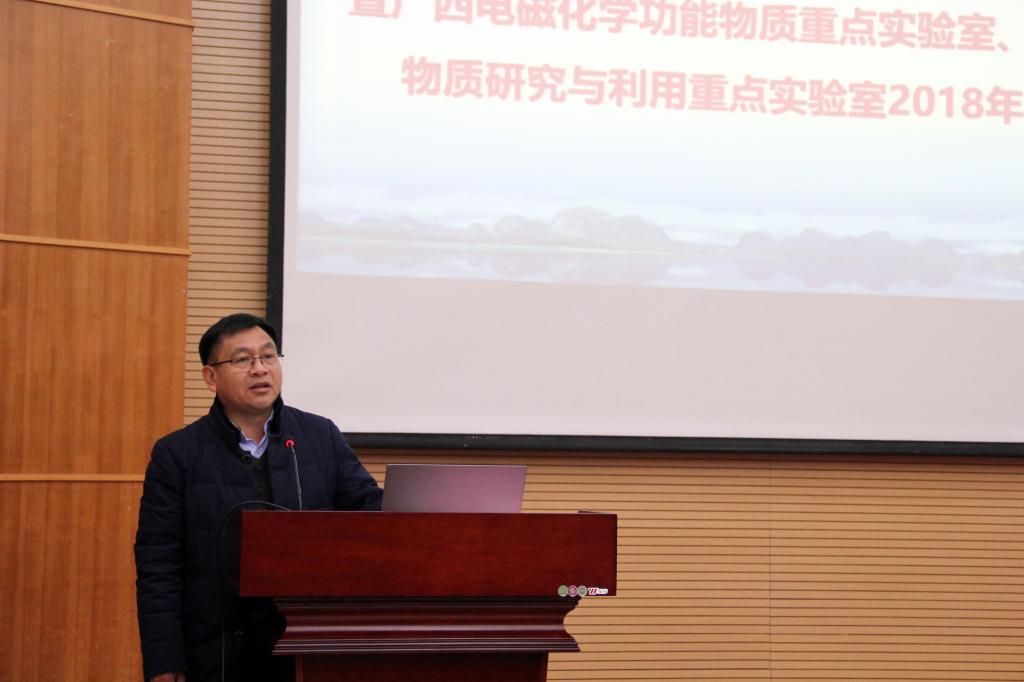 广西植物研究所所长李典鹏研究员出席开幕式并致辞。他介绍了广西植物功能物质研究与利用重点实验室基本情况,希望与会人员能在学术研讨会中互相了解广西电磁化学功能物质重点实验室、广西植物功能物质研究与利用重点实验室的工作重点,发现更多功能物质的特性,深入开展交流与学习,共同推动科研融合,争取在共同申报广西和桂林市重大科研项目方面获得重大突破。