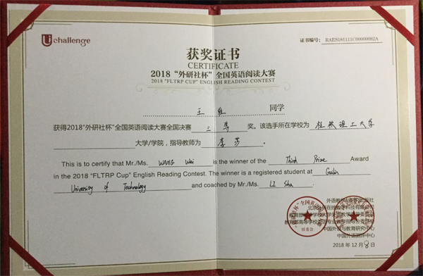 在12月7日—9日于北京举行的“外研社·国才杯”全国英语阅读大赛决赛上,王维同学再接再厉,获得全国决赛三等奖。全国有近9400所高校的约40万学生参加了英语阅读大赛初赛。本次决赛共有来自全国三十个省、市、自治区80多所高等院校的90名选手参加,这些选手均为各个地区组织的省级英语阅读大赛复赛的特等奖获得者。beat365选手能代表广西参加阅读大赛的决赛,与来自全国各高校的英语能手同台比拼,显示了beat365英语教学水平和学生英语能力的提升。