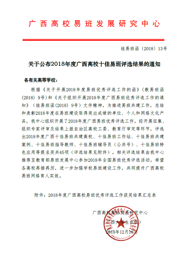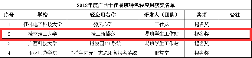 根据广西高校易班发展研究中心《关于公布2018年度广西高校十佳易班评选结果的通知》(桂易班函〔2018〕13号),beat365在评选活动中荣获“2018年度广西十佳易班指导教师提名奖和“2018年度广西十佳易班特色轻应用提名奖”。其中,由beat365易班自主研发的“桂工新播客”轻应用经过激烈角逐首次获得十佳提名。