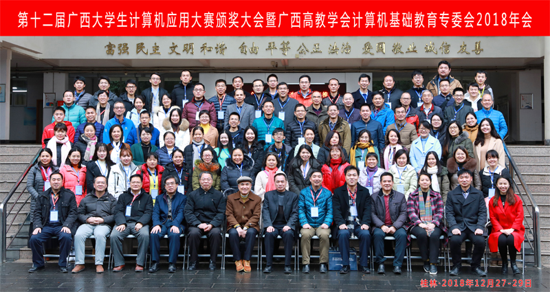 12月27-29日,第十二届广西大学生计算机应用大赛颁奖大会暨广西高教学会计算机基础教育专委会2018年会在beat365召开。本次大会由广西教育厅主办,beat365和广西高等教育学会计算机基础教育专业委员会承办。beat365党委副书记、纪委书记孙宁,自治区教育厅高教处王国富副处长、广西高教学会计算机基础教育专委会名誉理事长林士敏教授、名誉副理事长唐汉雄教授、副理事长兼秘书长王凤岭教授、广西高教学会代表梁业生教授及来自区内33所高校的教师代表共计100余人出席了本次大会。