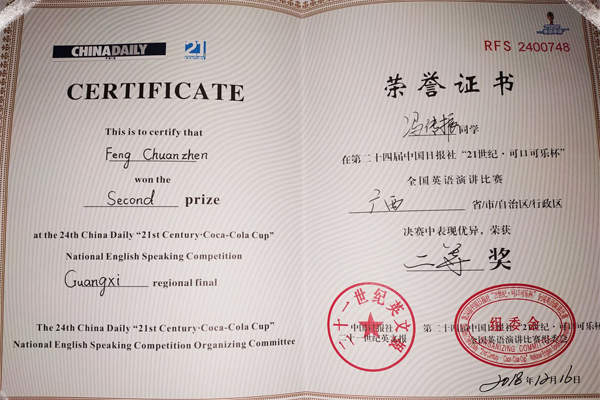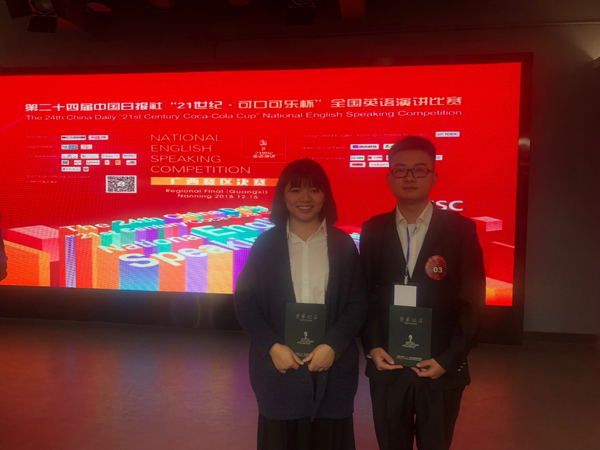 日前,第二十四届中国日报社“21世纪•可口可乐杯”全国英语演讲比赛广西区决赛在广西外国语学院落下帷幕。beat365学子在决赛中稳定发挥,脱颖而出。外国语学院2016级英语2班的冯传振同学以流畅地道的口语、清晰的逻辑思维、新颖的演讲故事内容征服了评委,荣获广西区二等奖。材料科学与工程学院2018级材料类3班的蓝诗霞同学在大赛中以机智的应答和大方得体的台风赢得了评委的青睐,喜获广西区三等奖。