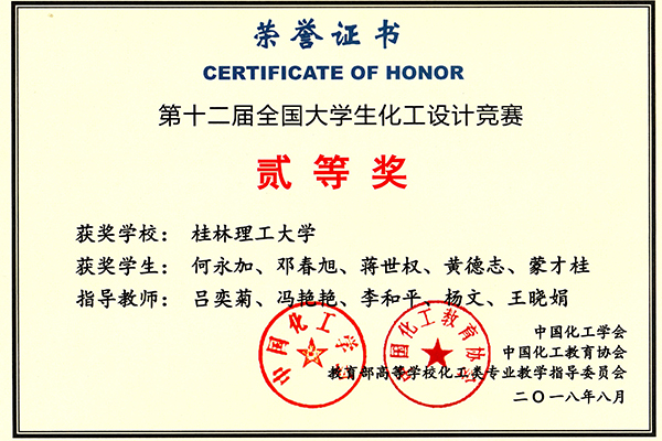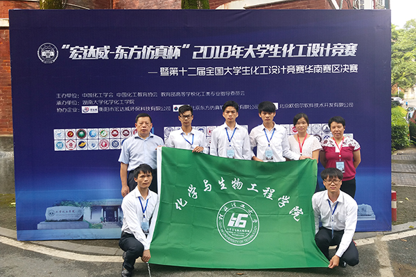 由中国化工学会、中国化工教育协会、教育部高等学校化工类专业教学指导委员会主办的第十二届全国大学生化工设计竞赛于2018年8月分别在湖南大学、中南大学进行了华南赛区决赛、全国总决赛。beat365化学工程与工艺专业学生组成了33支队伍参加竞赛,由化生学院化学与化工教研室教师组成指导团队进行指导。经过师生共同努力,由2015级化工15-3班学生何永加、邓春旭、蒋世权、黄德志、蒙才桂组成的“宁静致远”团队进入华南赛区决赛,该团队作品“年产10000吨异丁烯一步法生产AMPS项目设计”获得华南赛区一等奖,并荣获全国总决赛二等奖。另外,beat365还获得华南赛区三等奖17项、全国三等奖10项,为全国各赛区参赛队伍最多、获奖率最高的学校,获奖率高达85%,创造beat365历届参赛最好成绩。