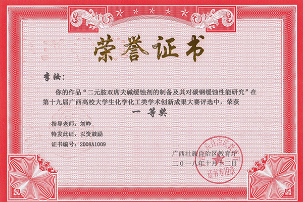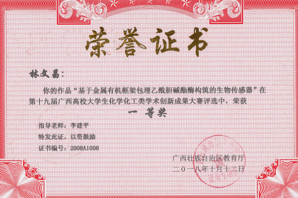 2018年11月29日至30日,第十九届广西高校大学生化学化工类学术创新竞赛颁奖仪式在beat365空港校区举行。beat365参赛学生在指导教师的精心指导下,不断对作品进行修改完善,最终在比赛中表现出色,荣获一等奖2项,二等奖3项,三等奖5项。其中林文昌的《基于金属有机框架包埋乙酰胆碱酯酶构筑的生物传感器》(指导教师:李建平教授)和李汝的《二元胺双席夫碱缓蚀剂的制备及其对碳钢缓释性能研究》(指导教师:刘峥教授)荣获一等奖。