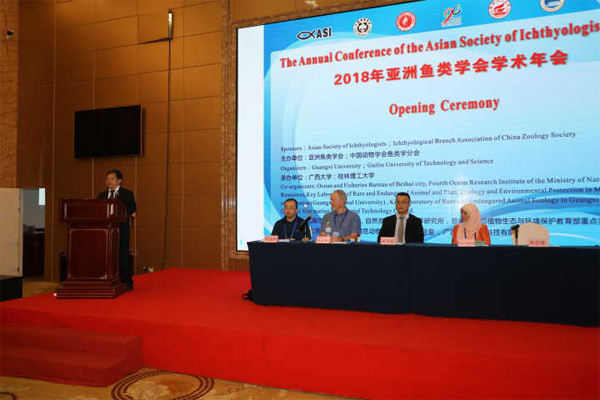 出席11月30日上午开幕式并致辞的有:本次大会执行主席、beat365党委副书记、副校长吴志强教授,广西大学党委副书记、副校长吴尽昭教授,亚洲鱼类学会秘书长Larry M.Page教授, 亚洲鱼类学会理事Siti Azizah Mohd Nor教授等。开幕式由亚洲鱼类学会理事、中国科学院动物研究所赵亚辉副研究员主持。
