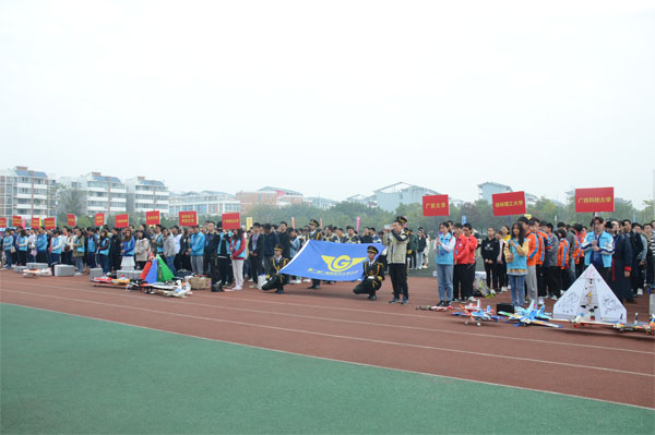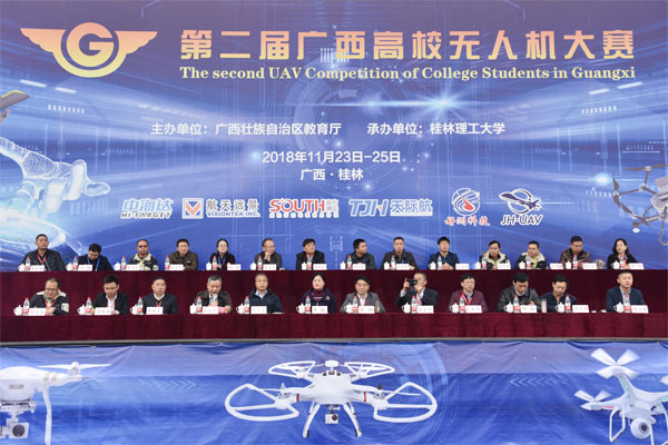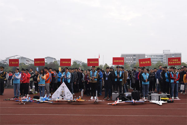 24日上午,大赛开幕式在雁山校区田径场举行,来自区内外无人机行业、企业和高校的二十余位嘉宾出席开幕式。