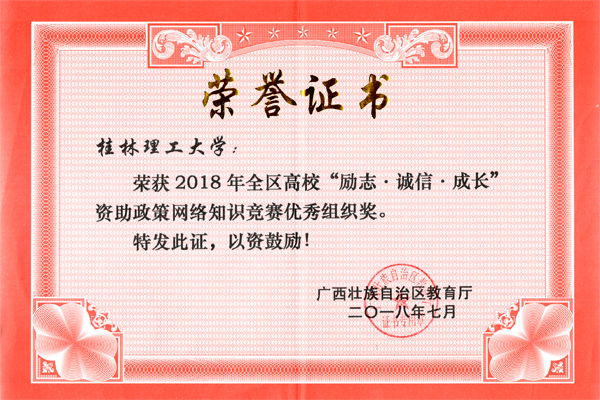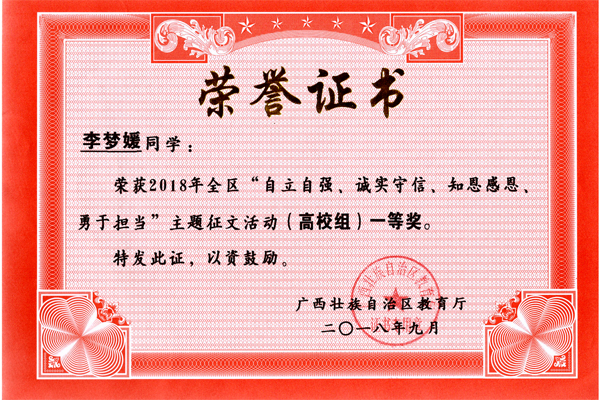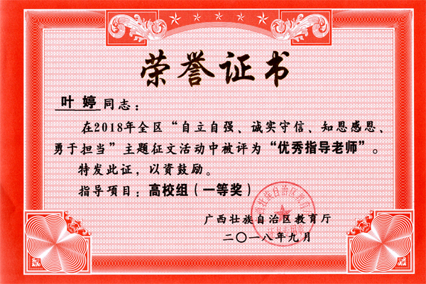近日,广西壮族自治区教育厅主办的2018年“学生资助政策宣传月”系列活动公布获奖结果,beat365在此次活动中喜获多项荣誉,在“自立自强、诚实守信、知恩感恩、勇于担当”主题征文比赛活动中荣获一等奖一项,二等奖两项,三位指导老师荣获“优秀指导老师”荣誉称号,学校在资助政策网络知识竞赛中获得“优秀组织奖”。