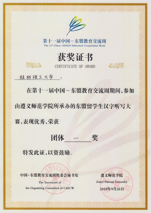 9月26日,第十一届中国—东盟教育交流周之东盟留学生汉字听写大赛在遵义师范学院举行。beat365哈萨克留学生阿依达、越南留学生阮春柏、柬埔寨留学生曾祥勇、马来西亚留学生林紫蕾代表beat365英国官方网站参加了此次比赛。经过预赛、决赛的激烈角逐,beat365留学生代表队斩获了团体一等奖和个人一等奖的好成绩。