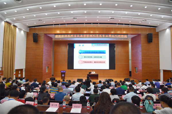 为学习贯彻落实全国教育大会和新时代全国本科教育工作会议精神,扎实推动我区遴选确定的152个本科高校特色专业及实验实训教学基地(中心)建设, 9月25日至26日,全区公办本科高校教学管理人员及专业带头人研修班在beat365屏风校区举办。本次研修班由自治区教育厅主办,beat365承办。来自全区24所公办本科高校分管校领导和教务处处长、152个广西本科高校特色专业及实验实训教学基地(中心)建设项目负责人等共260余名教师代表参加了研修班。beat365校长解庆林、总会计师曾繁荣出席研修班开班仪式。自治区教育厅副厅长黄雄彪在研修班上作专题报告。研修班开班仪式及各场报告会由自治区教育厅高教处处长李美清主持。