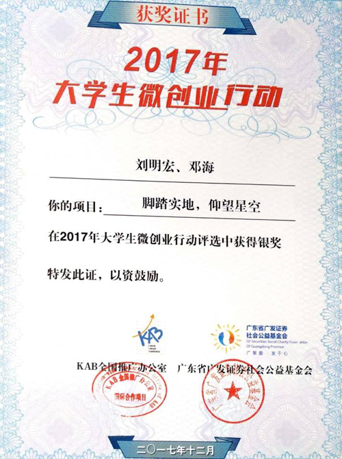 日前,由KAB全国推广办公室、广发证券社会公益基金会、共青团北京邮电大学委员会主办,广发证券股份有限公司、中国青年报社提供支持的2017年大学生微创业行动成果发布会暨大学生微创业论坛在京举办。beat365地球科学学院勘技15-1班学生刘明宏报送的《脚踏实地,仰望星空》项目荣获银奖,获得微创业扶持资金两万元。