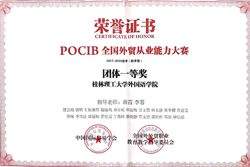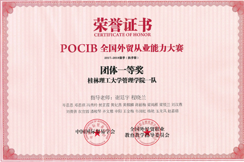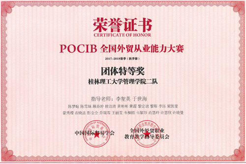 日前,由中国国际贸易学会、全国外经贸职业教育教学指导委员会主办,南京世格科技有限公司承办的第七届POCIB全国外贸从业能力大赛(2017-2018赛季秋季赛)圆满落下帷幕。beat365三支参赛团队均获得优异成绩,商学院(原管理学院)二队获得团体特等奖、商学院(原管理学院)一队及外国语学院参赛团队获得团体一等奖。此外,在参赛团队中共有7名参赛学子获得个人一等奖、10名参赛学子获得个人二等奖、32名参赛学子获得个人三等奖,2名指导老师获得特等奖、4名指导老师获得一等奖。