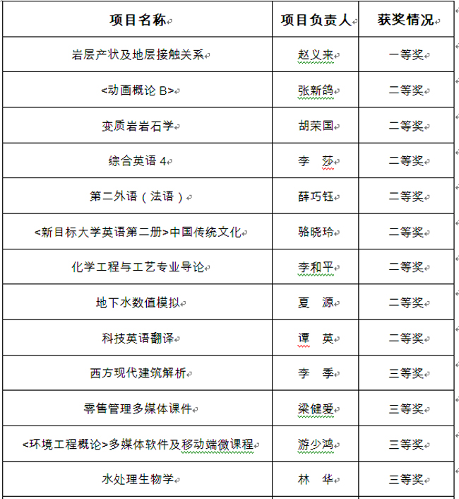 日前,由中央电化教育馆主办的第二十一届全国教育教学信息化大奖赛于十二月底落下帷幕,本次大奖赛高等教育组(含高职院校)共收集作品1634件,经过技术测试、专家评审和现场决赛,beat365教师的参赛作品分别获得一等奖1项,二等奖8项,三等奖18项。其中赵义来老师的微课作品《岩层产状及地层接触关系》,是桂林高校入围作品中唯一理工科类一等奖作品。张新鸽等8位老师的作品获得二等奖, 李季等18位老师的作品获得三等奖。获奖具体名单见下表: