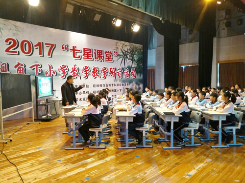 本次活动由桂林师范高等专科学校教育系主办,beat365英国官方网站附属小学承办,《广西教育》学术支持。桂林师范高等专科学校、桂林市教育科学研究所、桂林市各城区教育局相关人员及七星区各小学的师生共500多人与会。