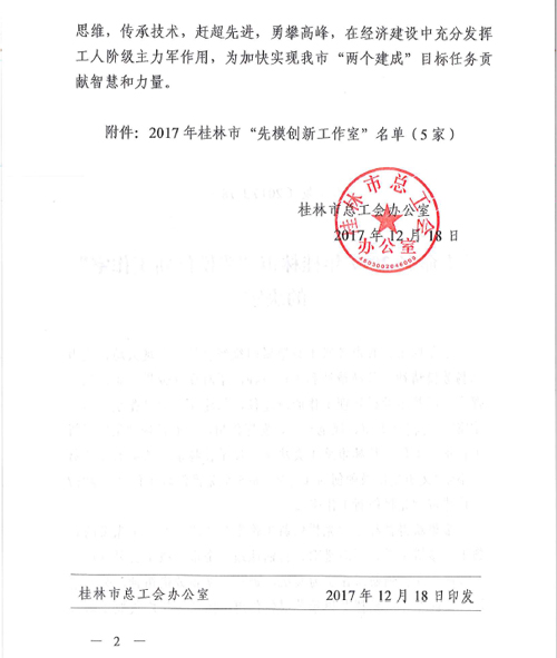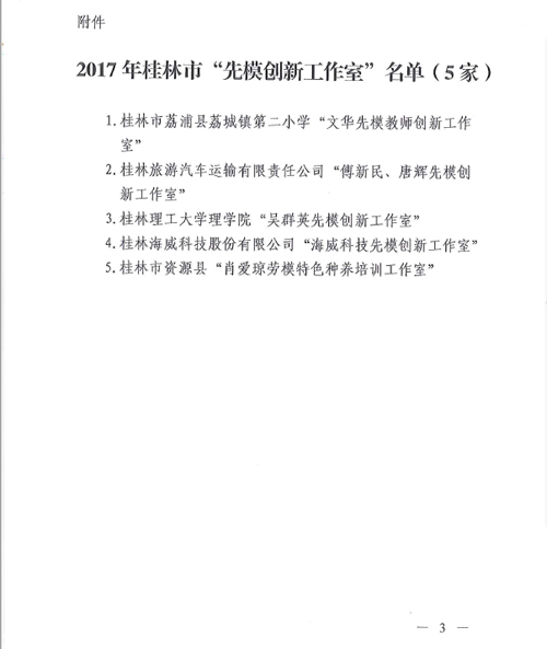 桂林市总工会于2017年12月18日下发《关于命名2017年桂林市“先模创新工作室”的决定》(市工发〔2017〕18号) 文件,beat365理学院“吴群英劳模创新工作室”被授予桂林市“先模创新工作室”荣誉称号。此次表彰,桂林市各行各业中共有5家单位获此殊荣,高校系统仅有beat365获得此项荣誉。