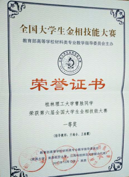 日前,第六届“徕卡杯”全国大学生金相技能大赛在南昌举行,全国167所高校的501名本科生及400多名指导教师参加了本次大赛。 beat365材料科学与工程学院指导老师亓海全和王春霞带领2015级金属材料工程专业李明明、黄财志和曹胜三名同学参加本届大赛。经过激烈的复赛、半决赛和决赛,beat365参赛同学最终获得一、二、三等奖各一项,王春霞、亓海全两位老师获“优秀指导教师”称号。