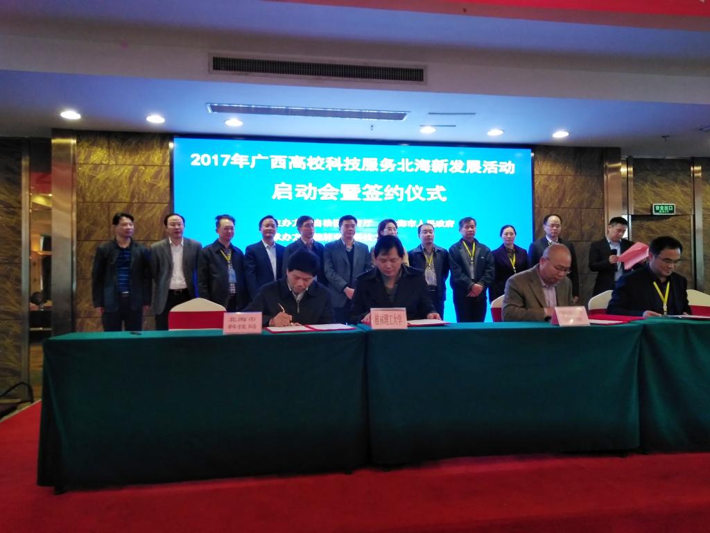 11月28日,2017年广西高校科技服务北海新发展在北海市举行,学校副校长陈学军带领科技处相关人员参加了此次活动。自治区教育厅副厅长黄雄彪、北海市人民政府副市长黄江与来自广西52所高校的校领导、科技处处长及科技专家代表、北海市相关部门与企事业单位代表出席此次活动。