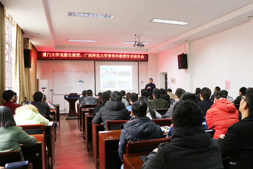 11月22日下午,应材料科学与工程学院邀请,厦门大学龙腊生教授和广西师范大学曾明华教授在beat365屏风校区2106报告厅分别作了题为“高核稀土及稀土过渡金属簇合物的合成及磁热效应”和“3d分子簇组装过程、性能调控及配位催化串联有机反应机理研究”的学术报告。