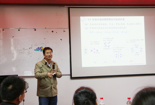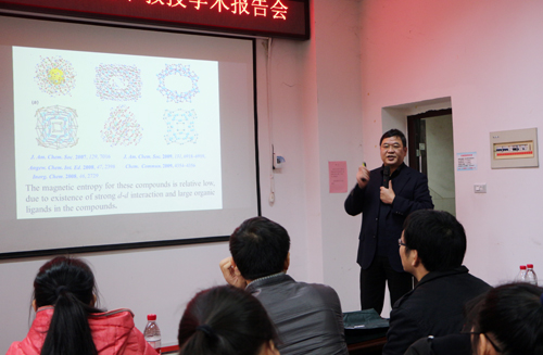 报告会上,龙腊生教授首先简单介绍了厦门大学的基本情况,之后介绍了其课题组近年来在高核稀土及稀土过渡金属簇合物的制备、结果表征以及磁热效应等方面的研究进展,包括材料磁热效应在制冷技术方面的潜在应用、影响磁热效应的因素以及如何控制材料的磁交换反应等内容。曾明华教授介绍了其课题组在3d金属离子复杂配位体系的组装过程反应机理、中间体的跟踪表征检测、配位分子簇在光催化、生物医学成像的应用等方面的研究进展。两位教授的报告内容丰富精彩,引起在场师生的共鸣。两位教授还与在场师生进行了互动交流。