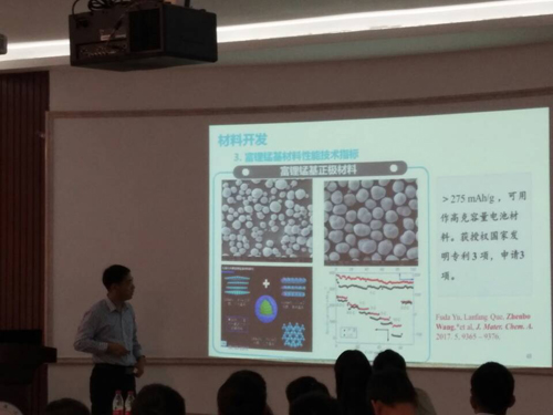 在报告中,王振波教授首先简要介绍了目前化学电源涵盖的电源种类及各自的优缺点,并在此基础上分别从基础问题类和关键技术类两个方面对铅酸电池、燃料电池、锂离子电池、Li-S电池、Li-空气电池、超级电容器和液流电池的研究现状、国家政策及未来发展趋势做了详细的介绍。他还结合自身科研实践,重点介绍了锂离子电池材料研究开发与产业化方面的经验与体会,给在场师生留下了深刻的印象。在互动环节,王振波教授详细解答了师生提出的问题。