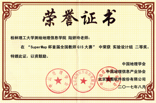 在由中国地理学会、中国地理信息产业协会、北京超图软件股份有限公司主办的SuperMap杯首届全国高校教师GIS大赛中,beat365测绘地理信息学院的陆妍玲、殷敏老师获得实验设计组的二等奖。