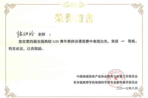 近日,第四届全国高校GIS青年教师讲课竞赛在首都师范大学举行,beat365测绘地理信息学院陆妍玲老师在本次竞赛中发挥出色,荣获一等奖。
