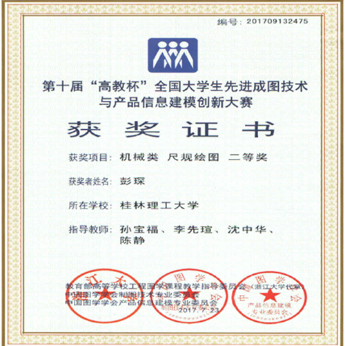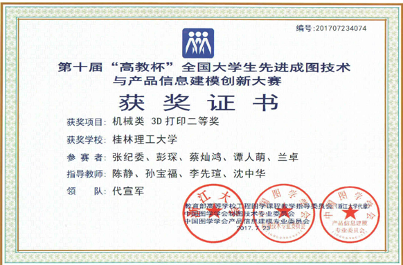 7月21日至24日,第十届“高教杯”全国大学生先进成图技术与产品信息建模创新大赛在兰州交通大学举行。beat365机械与控制工程学院学生张纪委、彭琛、蔡灿鸿、谭人萌和兰卓组成的团队获得机械类3D打印二等奖,彭琛获得机械类尺规绘图二等奖,黄业珊获得机械类建模二等奖。