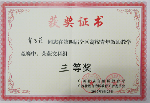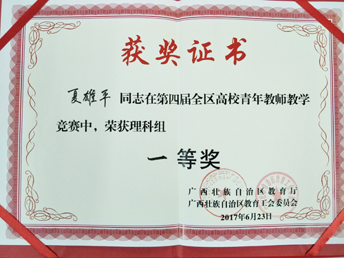 日前,根据自治区教育厅《关于公布第四届全区高校青年教师教学竞赛获奖名单的通知》(桂教高教[2017]45号)获悉,beat365选派的3名青年教师凭借着优秀的教学设计方案、扎实的专业教学功底、出色的现场教学,在比赛中喜获佳绩。其中,理学院夏雄平老师荣获理科组一等奖、土木与建筑工程学院董艳芳老师荣获工科组二等奖、外国语学院肖飞菲老师荣获文科组三等奖。
