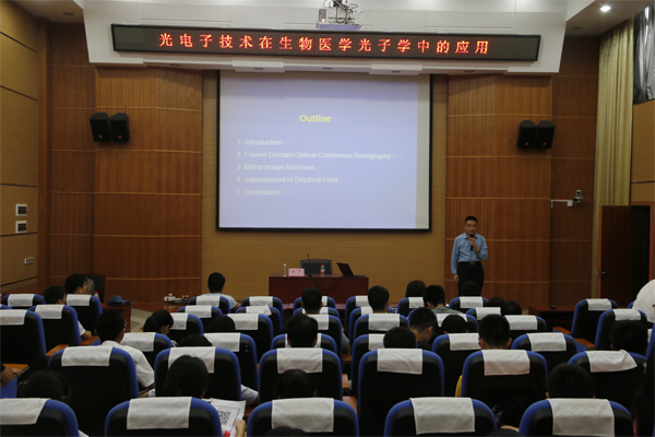 7月3日下午,应理学院邀请,美国密苏里大学(哥伦比亚校区)俞平教授在雁山校区12栋报告厅作了题为“光电子技术在生物光子成像中的应用”的学术报告,学校相关专业师生到场聆听了此次报告。 俞平教授主要讲述了光电子技术的原理以及光电技术在现代科技领域中的重要地位,并围绕光电子技术在生物光子成像中的应用,着重介绍了光学相干层析成像和断层扫描——OCT技术,并对其工作原理和临床应用进行了详细的阐述。会后,在场师生与俞教授进行了深入交流,现场研讨气氛浓厚。