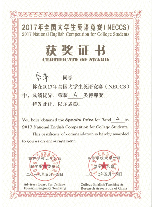 此外,唐萍同学还将于8月1日-6日参加2017年全国大学生英语夏令营。