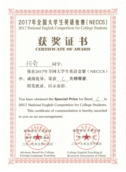 何奇同学C类特等奖证书