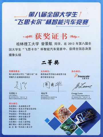 日前,第八届“飞思卡尔”杯全国大学生智能车竞赛总决赛在哈尔滨圆满结束。从全国各赛区参赛的400多所高校2000多支队伍中晋级的110所高校的160多支队伍角逐全国总决赛,beat365从华南赛区中晋级而出,作为广西高校中唯一一支晋级队伍参加全国总决赛,并取得全国二等奖一项。