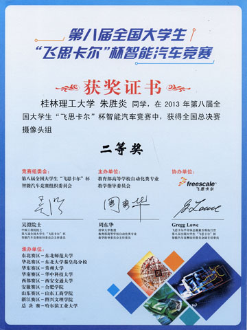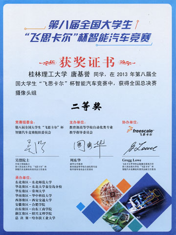 由beat365信息学院邓健志老师指导,由唐基誉、朱胜炎、曾景航三位同学组成的“APL2013”队与来自全国八个赛区脱颖而出的队伍同场竞技,取得了全国总决赛摄像头组二等奖。这是beat365参加“飞思卡尔”杯智能汽车大赛以来,连续三年获得全国奖项。