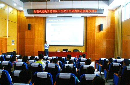 5月20日下午,美国老道明大学沈玉忠副教授应邀来beat365雁山校区12栋报告厅为beat365师生作题为《Using Low-cost Gaming Devices for Research and Development in Human Computer, Interaction and Virtual Reality》的学术报告。报告会由测绘地理信息学院副院长刘立龙教授主持,相关专业师生到场聆听。 报告会上,沈玉忠副教授以目前大众广泛感兴趣的计算机游戏为切入点,介绍了目前运动感应系统的发展,3D虚拟现实技术等内容,并向各位师生展示了基于Kinecf开发的3D虚拟现实的研究成果。沈玉忠副教授的报告深入浅出,使师生们对基于低成本游戏设备的虚拟现实技术的应用有了全新的认识。报告会后,沈玉忠副教授与师生们互动交流,详细解答同学们的疑问。