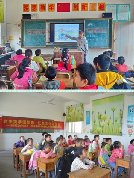在顺溪小学三年级学生教室里,周述忠老教授用连环画的方式讲述了瑶族少年小林从一个普通孩子成长成为一名红军小战士的革命故事。顺溪村小学门前有一座“全宝藏纪念塔”,是孩子们每天上学放学的必经之路,周老师在这里将革命烈士全宝藏荡气回肠的英雄事迹融入讲座,引导孩子们立下为国成才之志,坚定不移听党话、跟党走,努力成长为德智体美劳全面发展的社会主义建设者和接班人。